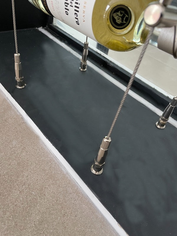 Create horizontal bottle suspension points using 1.5mm 7x7 cable from a 2.5mm 7x7 vertical cable for cable wine racks.